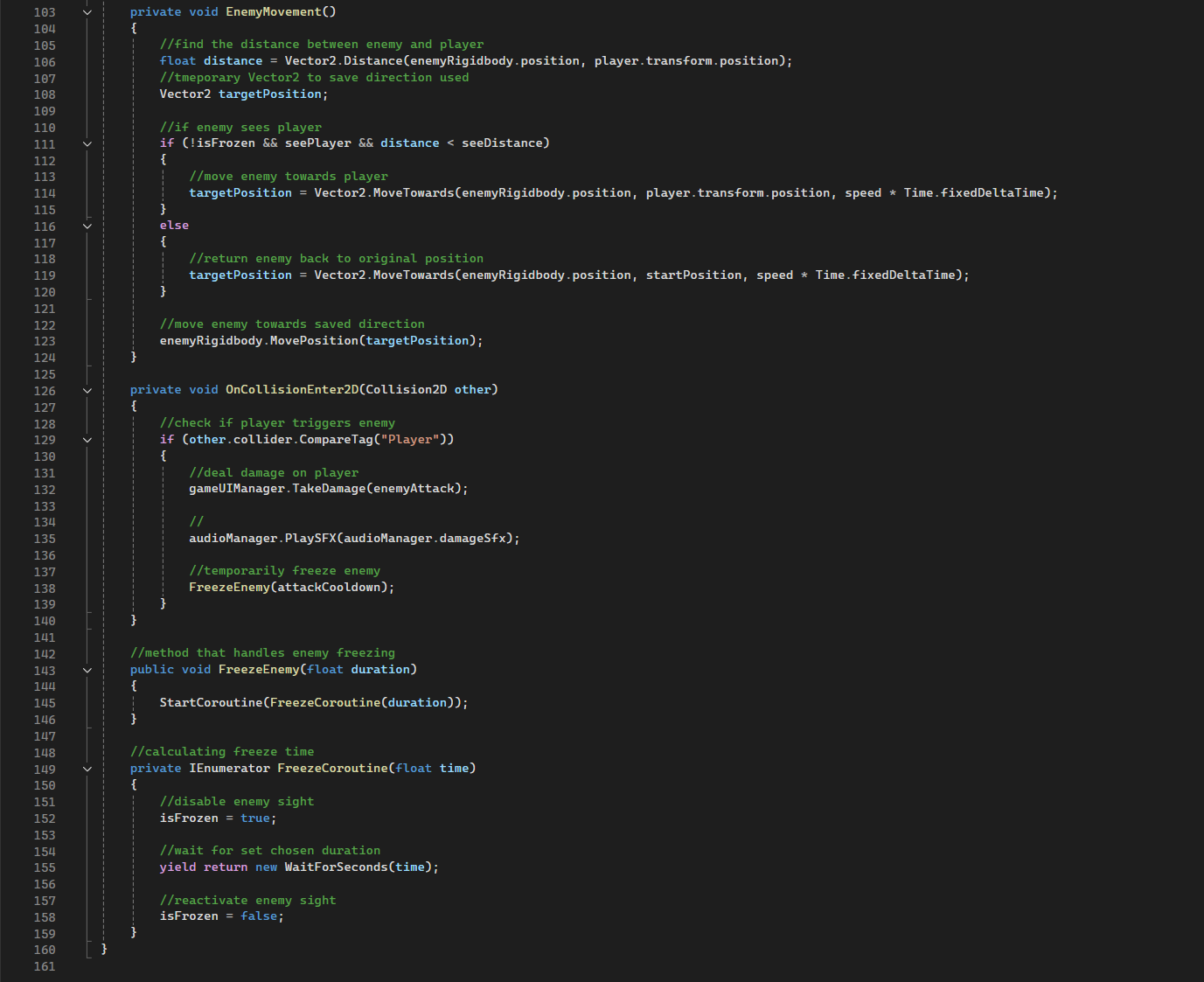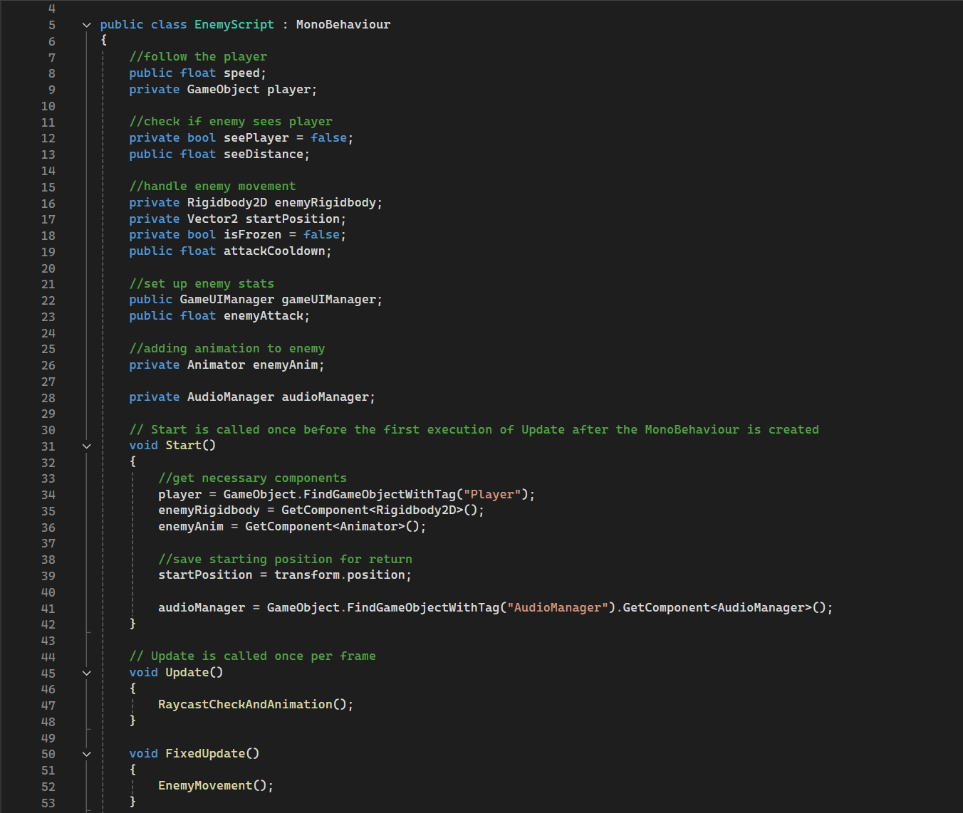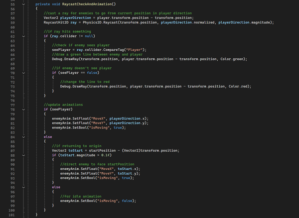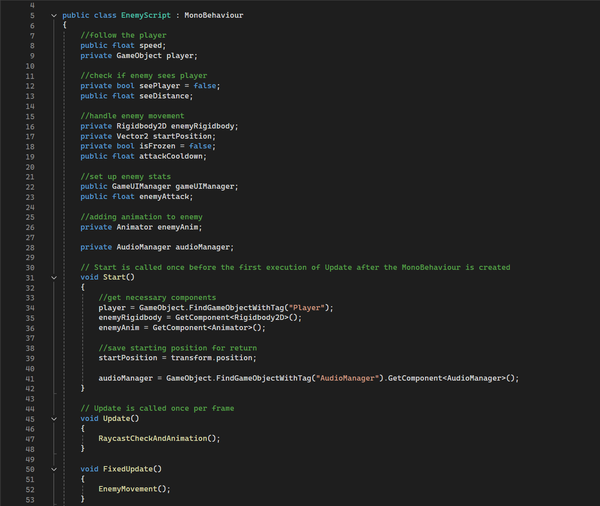 - The EnemyScript handles enemies that follow the player by casting a ray using RaycastHit2D and checking whether the player is within a specified distance to follow. It also deals damage to the player OnCollisionEnter2D and uses IEnumerator to freeze the enemy after attacking. seeDistance and enemyAttack are undefined within the code to allow customised enemy stats on Unity itself.