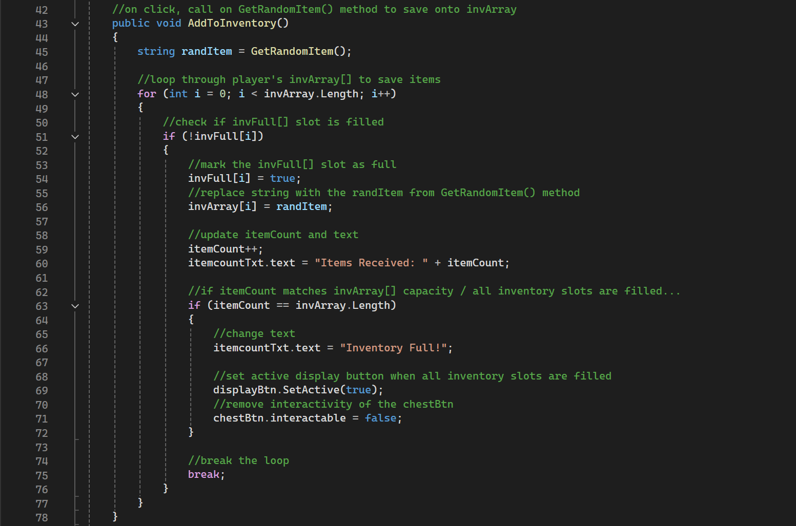 When tasked to create a 2D loot collection game in Unity that uses modular code with custom methods and a randomized item system, most of the coding aspect was smooth sailing except for one factor; upon reaching the max loot received, the player can continue to collect more items, causing previous items to be overwritten.